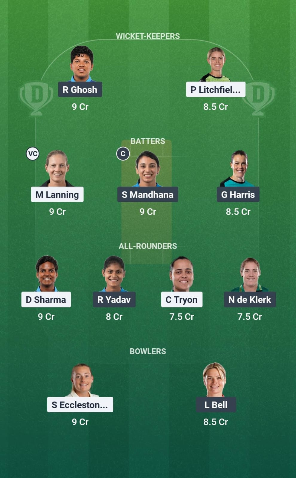 Richa Ghosh, Phoebe Litchfield, Grace Harris, Meg Lanning(VC), Smriti Mandhana(C), Chloe Tryon, Radha Yadav, Deepti Sharma, Nadine de Klerk, Sophie Ecclestone, Lauren Bell
